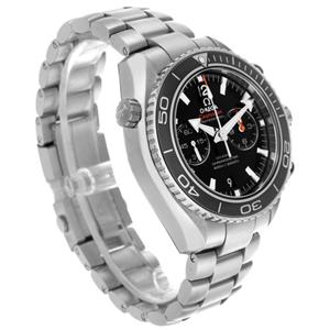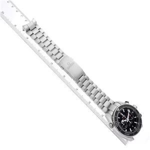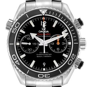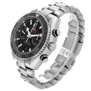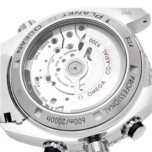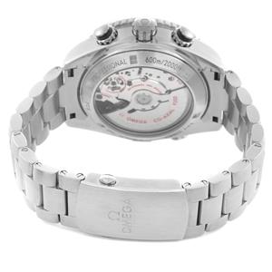 Stainless steel round case 45.5 mm in diameter. Helium escapement valve at the 10 o'clock position. Transparent exhibition sapphire crystal case back. Two pushers operate the chronograph function. Omega logo on the crown. |