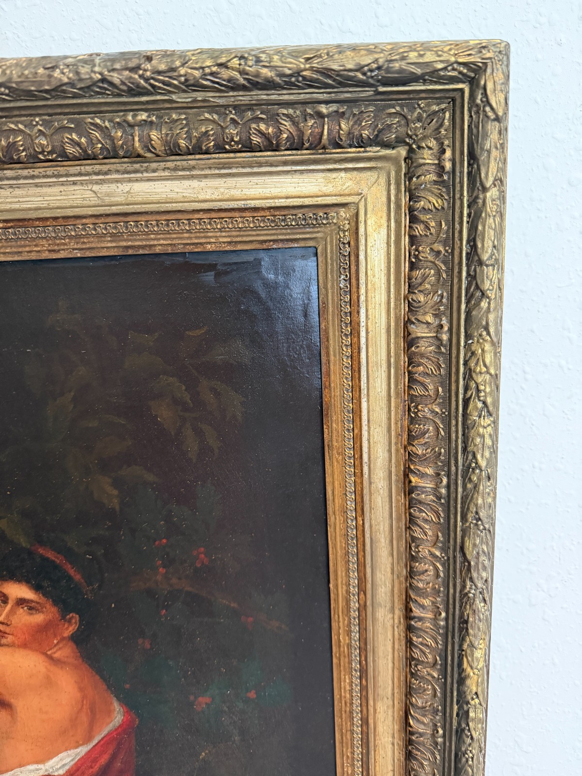 The surface shows a natural network of age-related craquelure, contributing to the authenticity and historical character of the work. The painting is housed in an imposing gilt wood frame with classical ornamentation, well suited to the scale and subject, and ready for display in a formal interior or curated collection of 19th-century academic art.