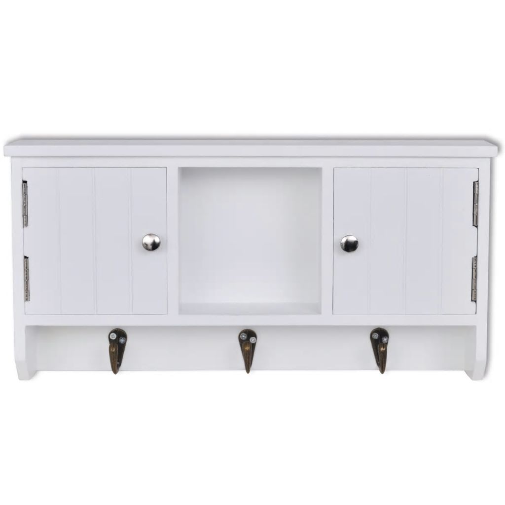 This key cabinet in antique white, with a simple yet elegant design, will make a decorative as well as functional addition to your home decor, as you can use it to keep your keys and other daily essentials organised. The wall cabinet has three metal hooks for placing keys. The two compartments with doors and the middle shelf provide plenty of space for storing wallets, mobile phones, sunglasses, jewelry, or other accessories. The MDF construction makes the cabinet strong and durable. The cabinet can be steadily mounted on the wall. The white paint finish makes it easy to clean with a damp cloth.