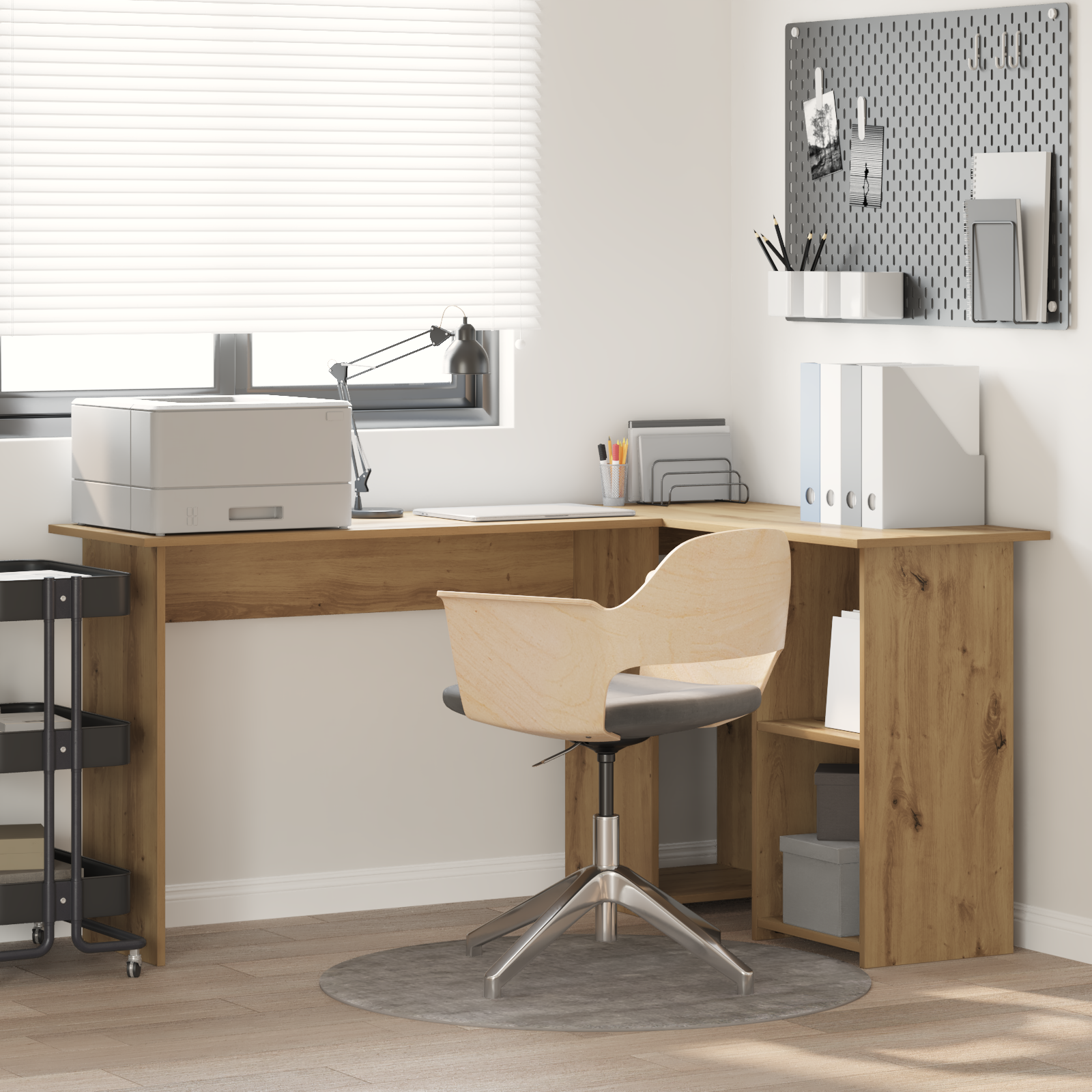 Dieser Computertisch hat eine moderne Ausstrahlung mit einem coolen Finish aus geräucherter Eiche, das in jedes Büro passt. Sein stylisches L-förmiges Design bietet viel Arbeitsfläche und eingebauten Regalen für zusätzlichen Stauraum, was dir hilft, organisiert und produktiv zu bleiben. Der Tisch hat vier eingebaute Regale, ideal für Bücher und andere Dinge, damit du deinen Arbeitsplatz ordentlich und aufgeräumt hältst und konzentriert bleibst. Die glatte Oberfläche sieht toll aus und ist super pflegeleicht – einfach mit einem feuchten Tuch abwischen. Robust aus Holzwerkstoff gefertigt, ist der Tisch stark genug, um schwere Lasten zu tragen, perfekt für mehrere Computer-Setups oder viele Arbeitsmaterialien. Mit großzügigen Dimensionen ist dieser Tisch ideal für Büroanwendungen und bietet viel Arbeitsfläche, während er Ecken optimal nutzt. Sein modernes Design passt gut zu verschiedenen Einrichtungsstilen und ist eine großartige Wahl für Home-Offices, bei denen Funktionalität zählt.
