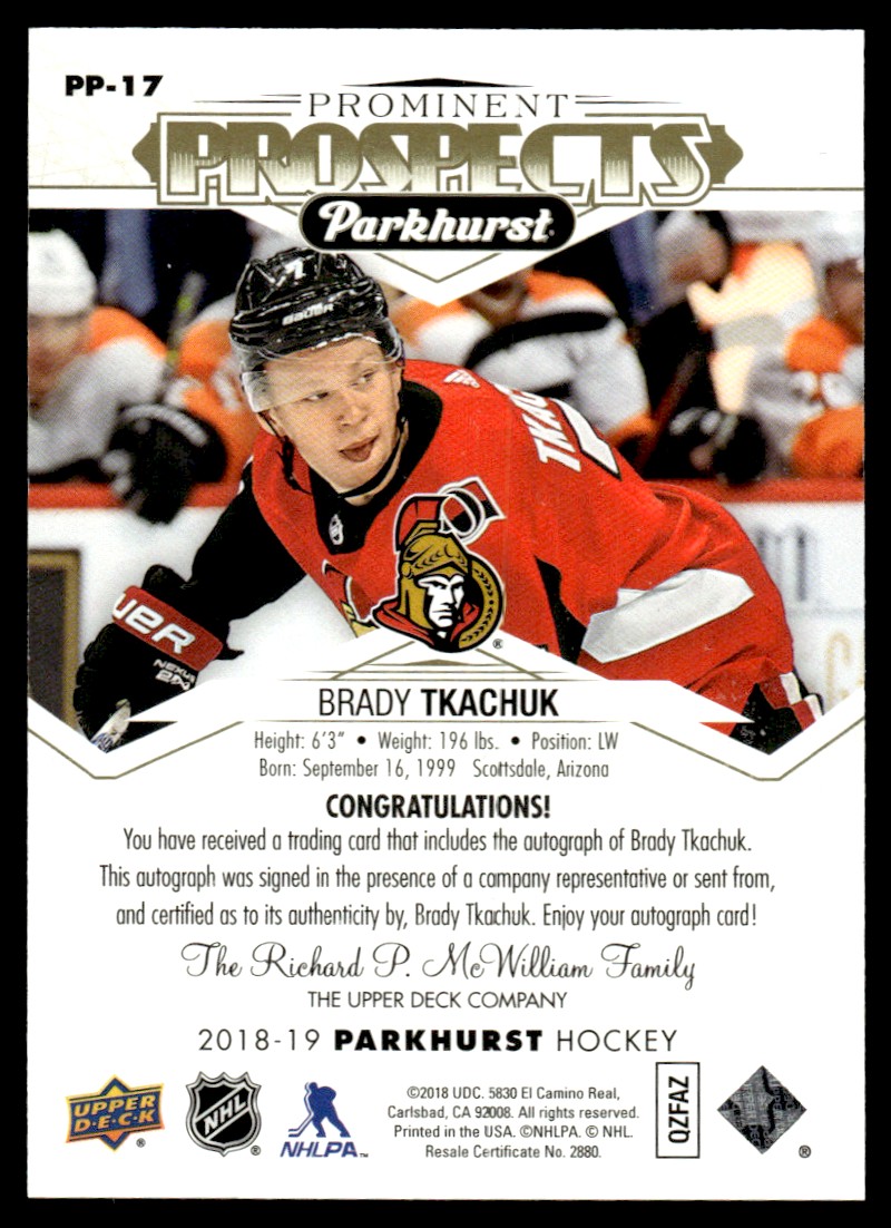 | 2018-19 Parkhurst Prominent Prospects Signatures Brady Tkachuk Auto Ottawa | ||||||||||||||||||