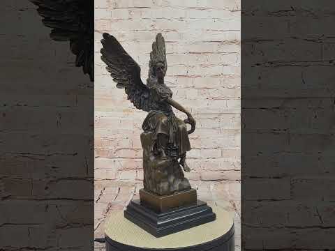 Poised with grace and divine purpose, this captivating bronze sculpture captures the essence of a guardian angel in a moment of celestial connection. Seated upon an elegant pedestal, she turns her body with an air of serenity, holding a wreath delicately in her hand, as if poised to crown a young cherub. Her countenance exudes innocence and tenderness, with delicate features that radiate a sense of angelic protection. Her meticulously crafted wings, adorned with intricate details, evoke a sense of ethereal magnificence that adds to her heavenly presence.The guardian angel's relaxed posture, with a subtle exposure of her breasts, symbolizes her tranquil watchfulness over those in her care. Crafted with utmost precision and care, this sculpture is a testament to the skillful artistry of the French artisan Moreau. Using the revered ""Lost Wax Method,"" the sculpture is expertly cast in bronze, lending it a timeless quality that is both enduring and enchanting. The sculpture's warm brown patina adds depth and character, enhancing its visual appeal and bringing out the nuances of every intricately designed feature.Mounted on a sleek marble base that bears the signature of the artist Moreau, this masterpiece stands as a testament to the artist's ability to breathe life into bronze. As a guardian angel, this sculpture exudes a sense of watchful protection and celestial benevolence, making it a perfect addition to any collection or space seeking to evoke a sense of divine presence. Whether displayed as a centerpiece or cherished as a prized possession, this exquisite sculpture invites admiration for its exquisite craftsmanship and timeless portrayal of heavenly grace.