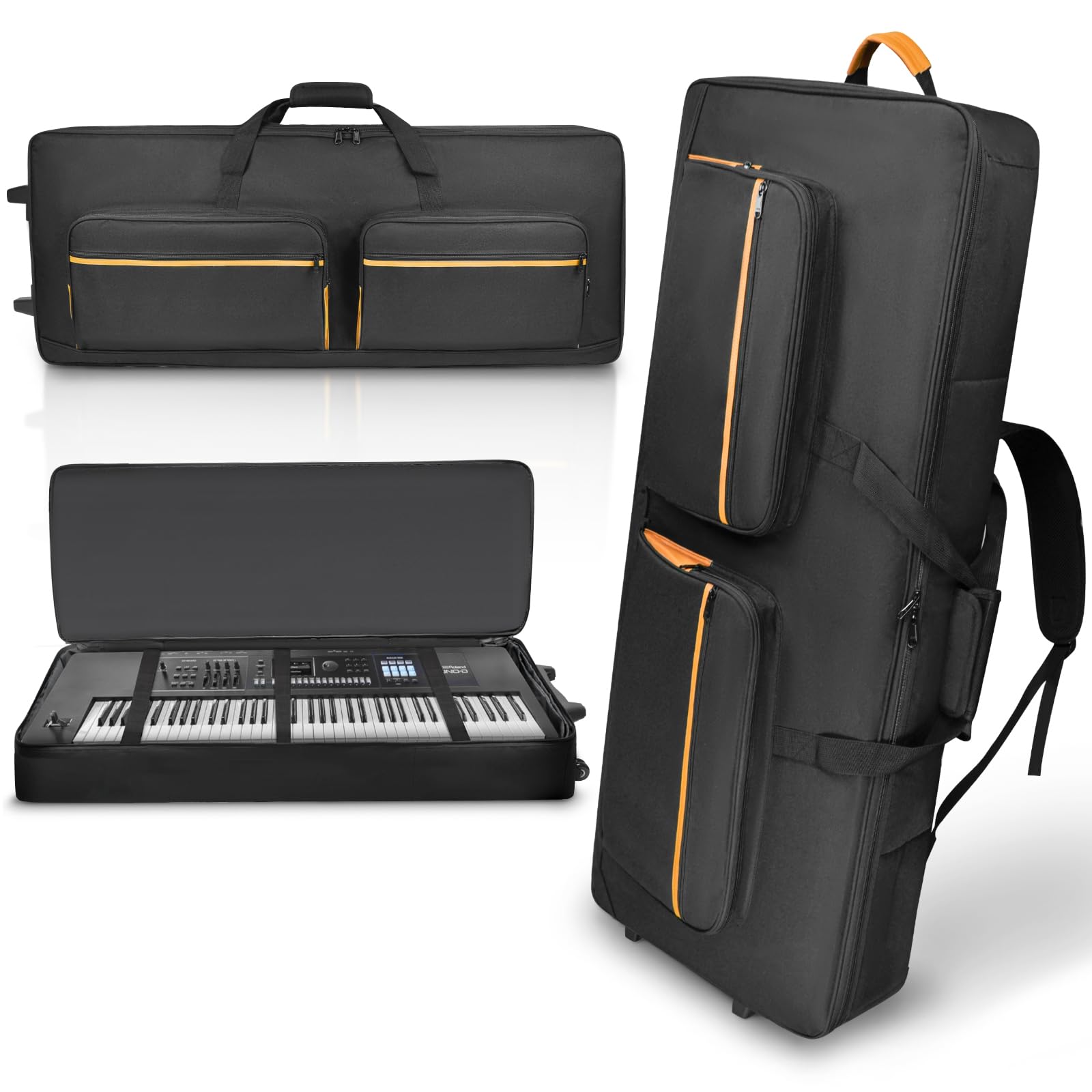 【Convenient and Easy to Carry】 Designed for ultimate convenience, this 73/76-key keyboard bag includes built-in wheels and versatile carry handles, allowing you to carry it vertically or horizontally. The rolling feature minimizes the weight load, making it ideal for musicians who need flexible, lightweight transport for performances, rehearsals, and travel