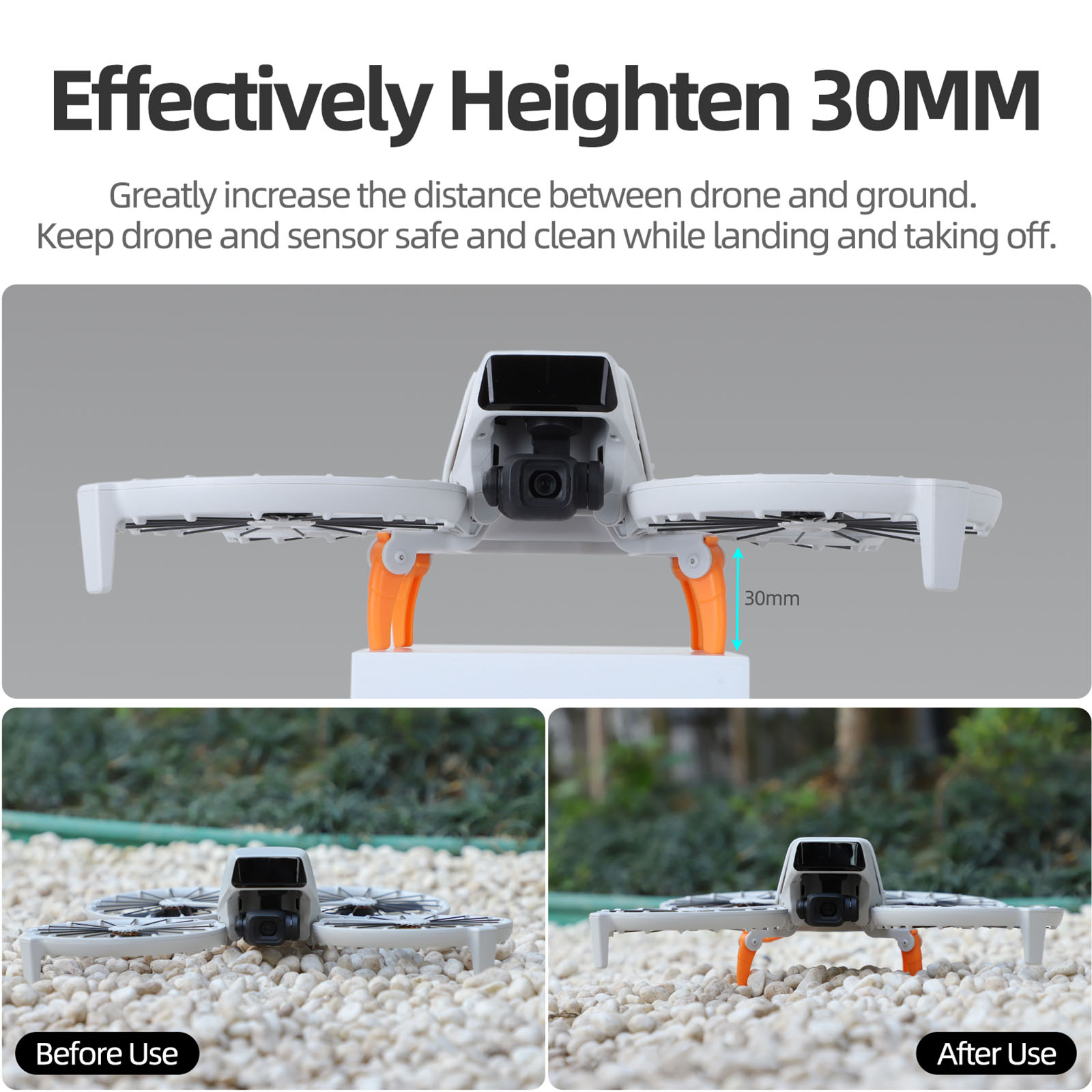 l The effective height increase of 30mm greatly increases the spacing between the fuselage and the ground, effectively preventing ground debris from damaging or dirtying the fuselage, sensors, etc. during takeoff and landing