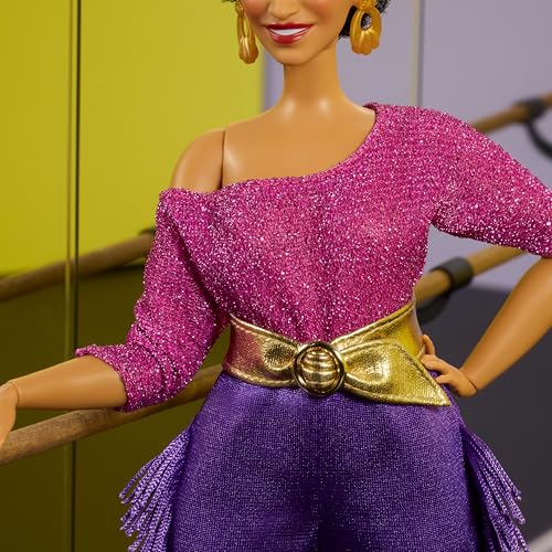 Barbie Signature - Debbie Allen, bambola snodata della collezione Tribute con top a spalle scoperte, cintura dorata e pantaloni viola con frange e scaldamuscoli, 6+ anni, JBJ24