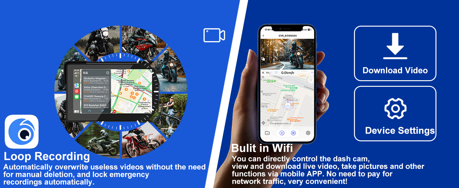【Includes 128GB SD Card】Enjoy double the storage capacity compared to standard 64GB memory cards. The loop recording function automatically overwrites non-essential footage while securely locking emergency recordings, ensuring continuous recording for your motorcycle journeys without manual file management.