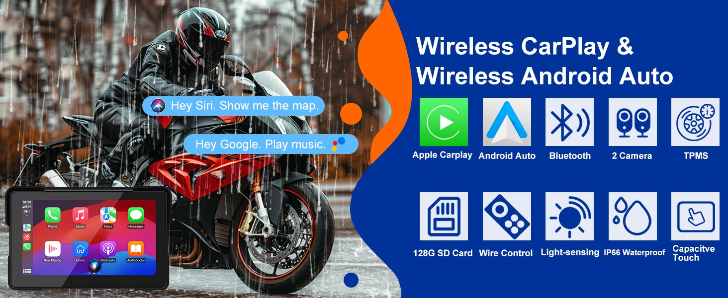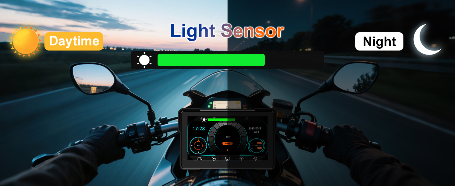 【Motorcycle Camera System with Dual 1080P Cameras】Our motorcycle carplay with camera captures crystal-clear footage with front and rear 1080P cameras, providing complete riding coverage. Featuring dual-channel recording and an included 128GB SD card for ample storage capacity, this system also supports gps para motos navigation for smarter rides. The automatic light-sensing chip intelligently adjusts screen brightness for optimal visibility in all lighting conditions.