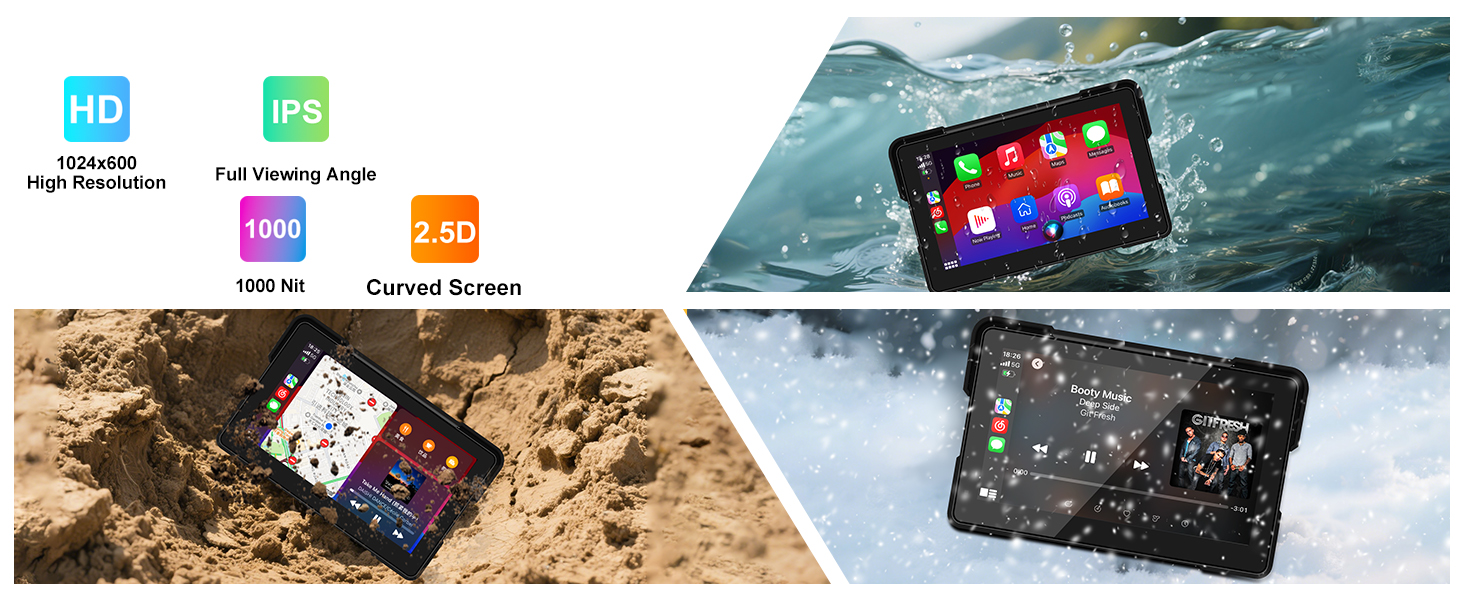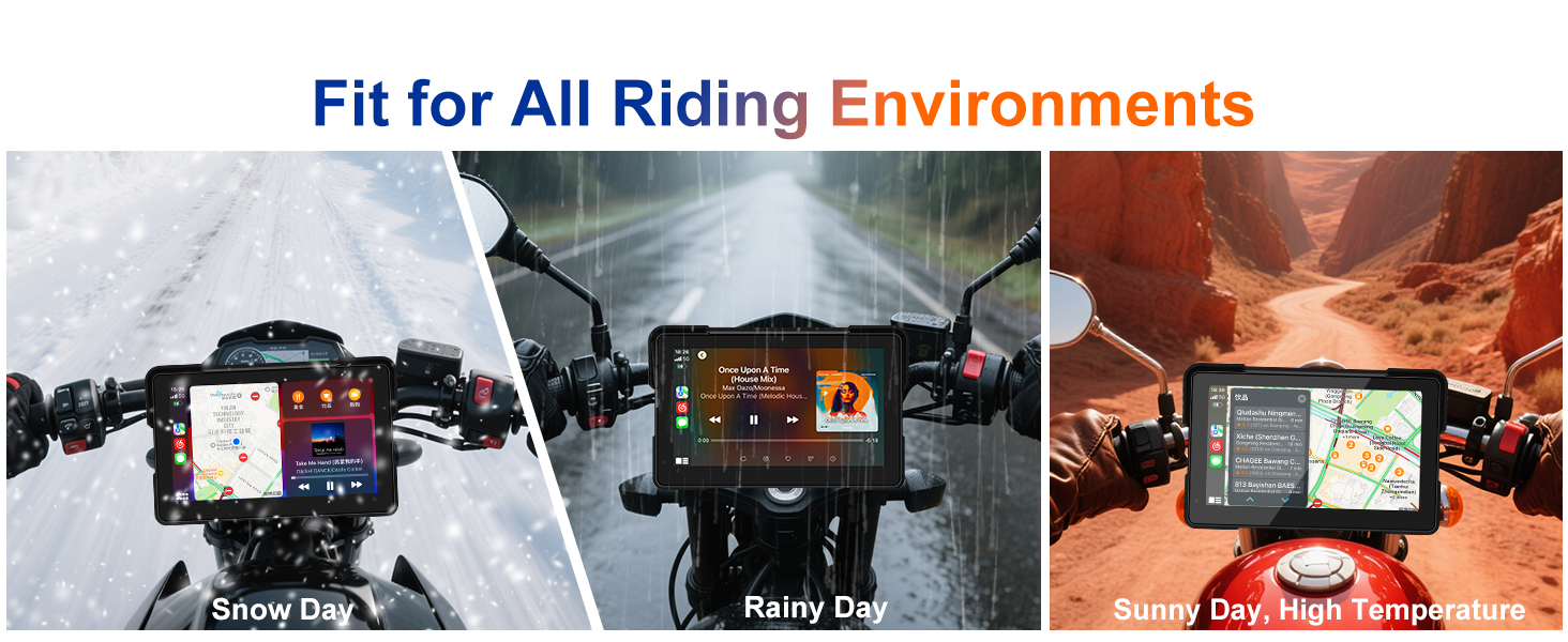 【IP67 Waterproof Motorcycle Touchscreen】The 7-inch IPS motorcycle carplay waterproof display is bright and clear, even under direct sunlight, and touch response is fast. The IP67 waterproofing works flawlessly when you ride in rain or snow. The pantalla para moto features advanced liquid nano coating technology that repels raindrops and protects against dust and sand infiltration, ensuring reliable performance in all weather conditions for safer riding.