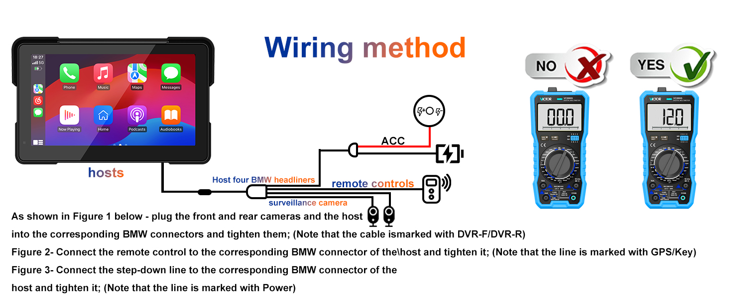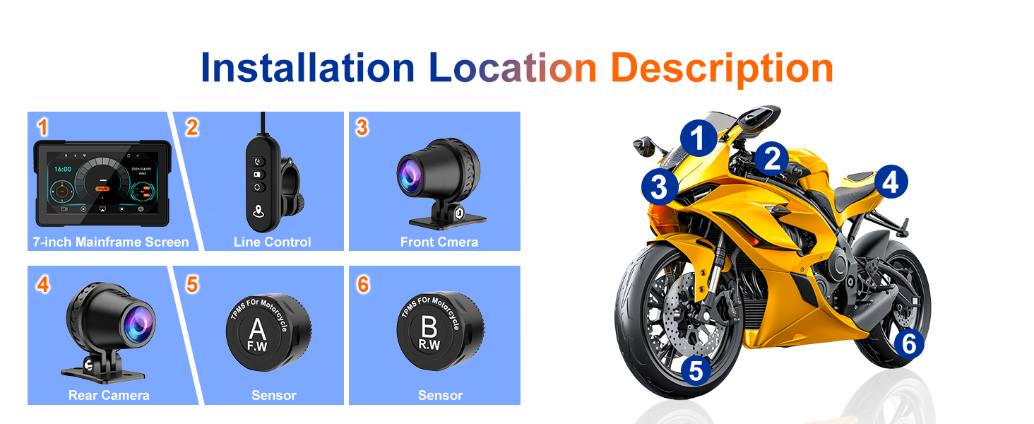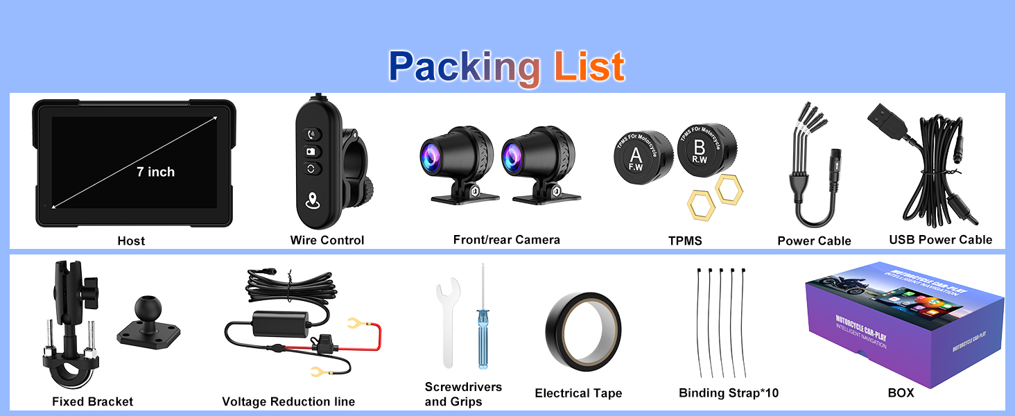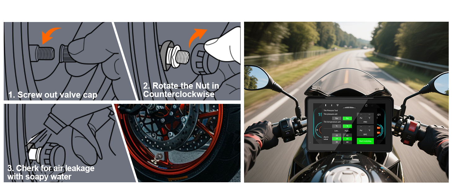 【7-Inch IPS Carplay Para Moto with TPMS Sensor】This dash cam for motorcycle carplay applies the 7-inch IPS display screen, with 1440x720 resolution, 170° full-viewing angle, and high contrast for ultra-clear visuals. The built-in WiFi lets you control your motorcycle video recorder directly through the mobile app to view live video, download footage, take pictures, and more.