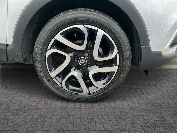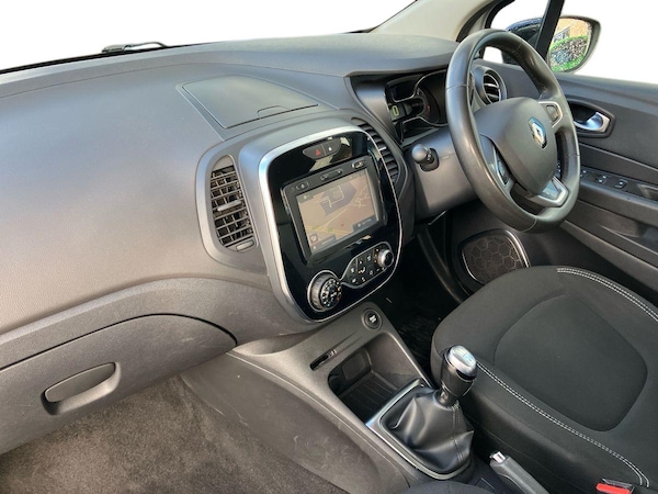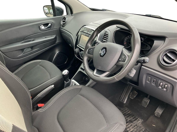 ..Cruise control + speed limiter, Eco mode, Smartphone cradle, Trip computer, Variable PAS, Auxiliary input socket, DAB Digital radio, Fingertip controls for audio system, Body colour door handles, Body coloured bumpers, Electric front windows + one touch + anti-pinch, Electric rear windows, Extra tinted glass in rear windows and tailgate, Front skid plate, LED daytime running lights, LED front fog lights, Rain sensitive wipers + automatic lighting, Rear skid plate, Rear wiper, Variable intermittent front wash/wipe, 12V Accessory socket, 3 rear headrests, 60/40 split rear seats, Centre console storage tray, Climate control, Compartment in glovebox, Dark harmony dashboard and door panels, Fixed cloth upholstery, Front cupholder, Front seat backrest storage nets, Height adjustable driver's seat, Height adjustable front headrests, Height/reach adjust steering wheel, ISOFIX on front passenger and rear outer seats, Leather steering wheel and gear knob, Pollen filter, Removable storage between driver and passenger, Reversible boot floor, Storage area on top of dashboard, Storage compartments in doors, Variable boot floor, Exterior touch pack Chrome - Captur, Interior touch pack Chrome - Captur, 3 point seatbelts on all rear seats, ABS+EBA, Driver/Front Passenger airbags, ESC - Electronic Stability Control + traction control, Front passenger airbag deactivation, Front side airbags(head+thorax), Hill start assist, Rear door child safety locks, Seatbelt warning, Tyre pressure monitor, Deadlocking system, Keyless entry, RAID (Renault Anti-Intruder Device) with automatic door locking, Thatcham Cat 2 engine immobiliser, 17'' Explore alloy wheels with black inserts