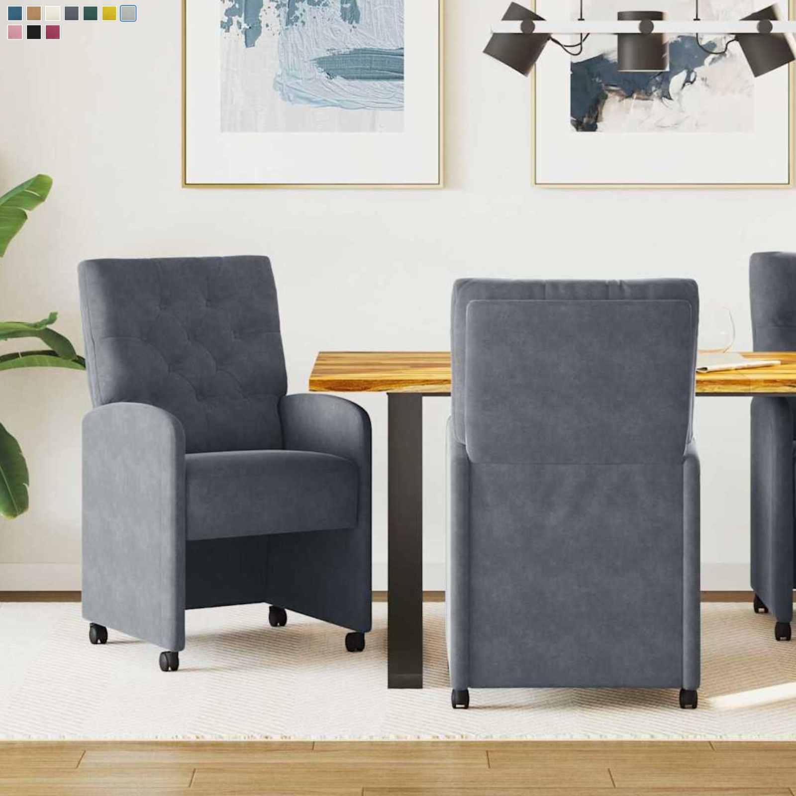 Diese Küchen-Esszimmerstühle strahlen moderne Eleganz aus und verleihen jedem Essbereich das gewisse Etwas. Ihr minimalistisches Design mit klaren Linien und praktischer Einfachheit macht sie ideal für zeitgemäße Innenräume. Egal, ob du große Dinnerpartys oder entspannte Familienessen hast – diese Stühle bieten beides: Komfort und Stil. Kunstleder-Oberfläche: Die Stühle haben ein hochwertiges Kunstleder, das super aussieht und leicht sauber zu halten ist. Es ist flecken- und abriebfest, was sie zur praktischen Wahl für viel genutzte Küchen und Esszimmer macht, ohne dass du auf Style verzichten musst. Track Armlehnen: Die ergonomischen Armlehnen bieten einen perfekten Platz zum Entspannen und passen gut ins schlanke Design des Stuhls. So wird das Sitzen angenehmer, besonders bei längeren Essen oder Gesprächen. Schaumstoffpolsterung für Komfort: Die Stühle sind mit Schaumstoff gepolstert, was dir maximalen Komfort gibt. Die leichten und effektiven Kissen sorgen dafür, dass du immer bequem sitzt. Mobilität mit Rollen: Dank der eingebauten Rollen sind diese Stühle leicht zu bewegen. Egal, ob du den Essbereich umgestalten oder einfach mal einen Stuhl rausschieben möchtest – alles geht kinderleicht. Einfache Montage erforderlich: Die Montage ist total unkompliziert und du brauchst nur einen Schraubendreher. Die Anleitung ist klar, damit du die neuen Esszimmerstühle ganz schnell genießen kannst.