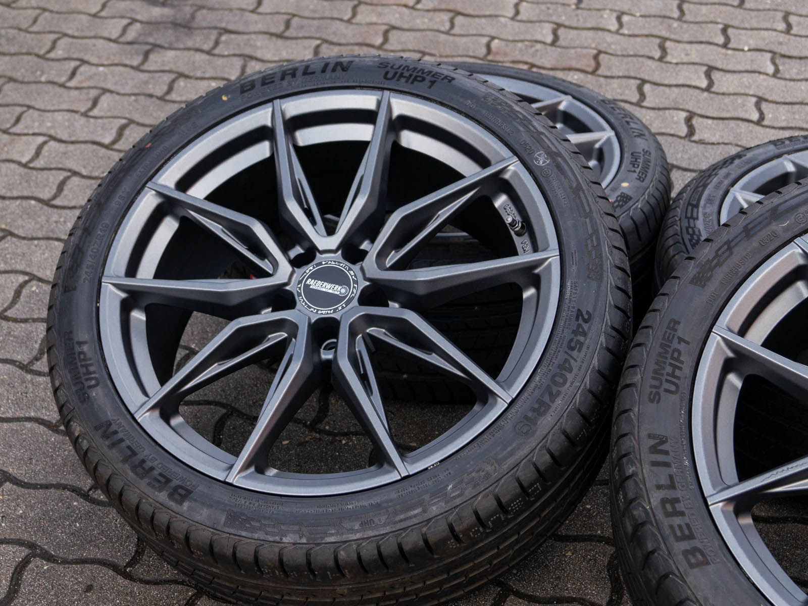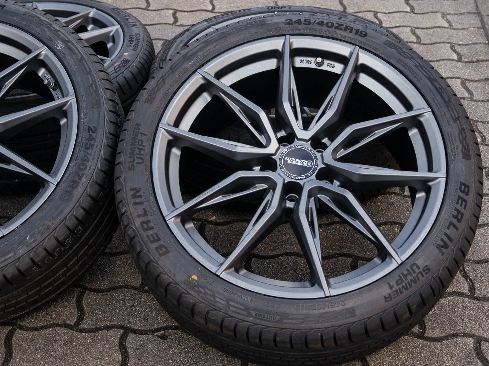 4x neue Sommerkompletträder (montiert und gewuchtet) in 19 Zoll - Felge: RW02 8,5x19 ET35 5x120 Grey Matt - Reifen: Tageseinkauf (Tracmax, Tristar, Fortuna etc.) 235/45 R19 - 1x ABE/Gutachten - 4x Nabendeckel Raederwerk - gegen Aufpreis mit Reifendrucksensoren RDKS lieferbar
