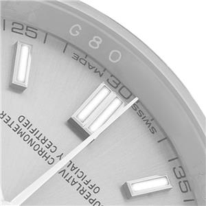 Silver dial with luminescent baton hour markers and hands. Arabic numerals at 3, 6, and 9 o'clock. |