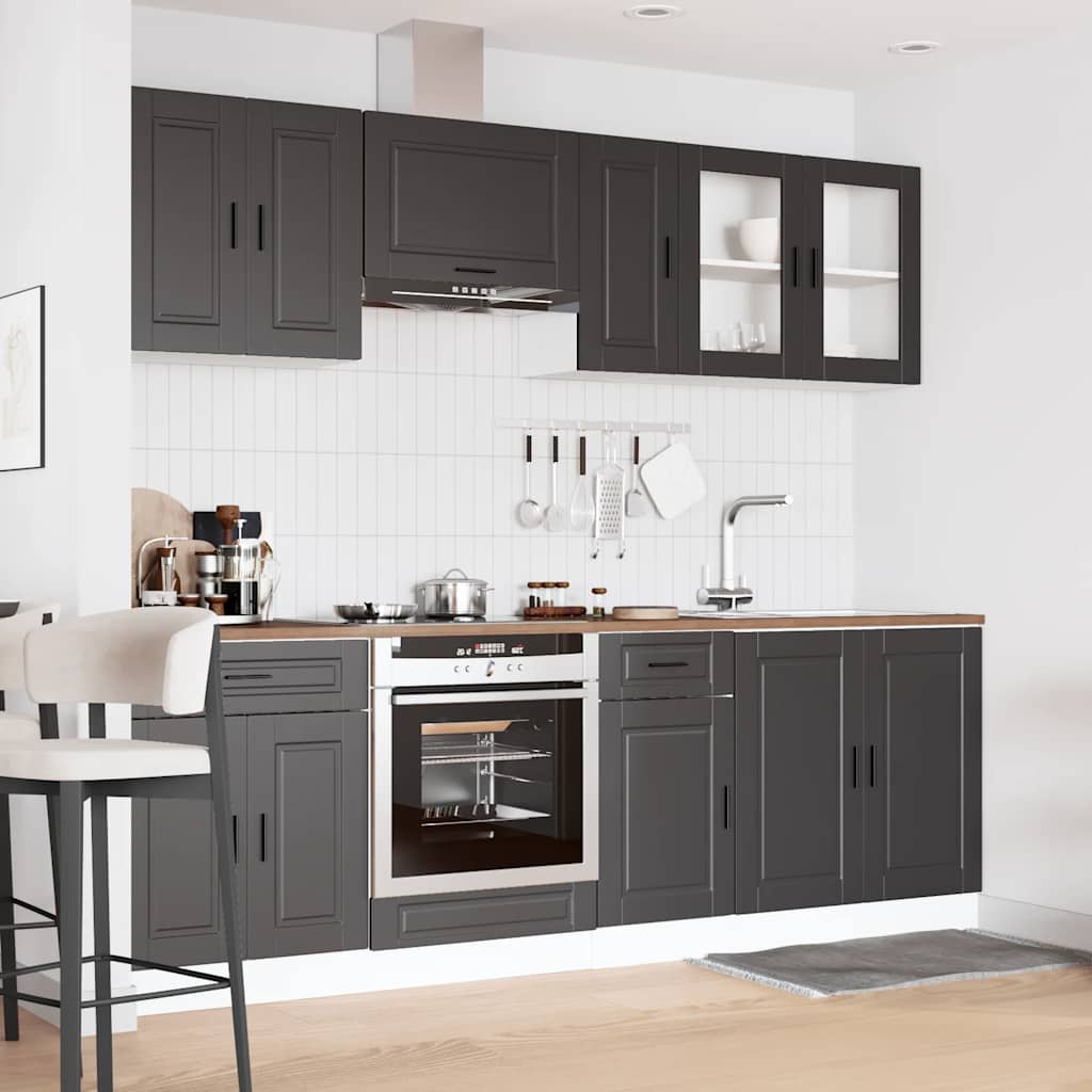 Mit ihrem eleganten Design optimiert diese 8-teilige Küchenzeile Ihre Küche und bietet reichlich Platz für Ihre Küchenausstattung! Starkes und langlebiges Material: Holzwerkstoff ist ein langlebiges und robustes Material mit einer glatten Oberfläche, das gegen Feuchtigkeit, Verformung und Rissbildung beständig ist, wodurch es eine zuverlässigen Wahl für die Herstellung von Möbeln ist.Viel Stauraum: Das Küchenschrank-Set hat viele Fächer und bietet ausreichend Platz für Schüsseln, Teller, Töpfe und andere Küchengeräte.Verstellbare Füße: Die Unterschränke sind mit verstellbaren Füßen ausgestattet, die sich in der Höhe an deine Kücheneinrichtung anpassen lassen.Pflegeleicht: Dank der glatten Oberfläche lassen sich diese Küchenschränke leicht mit einem feuchten Tuch reinigen und benötigen weniger Pflege. Achtung:Um ein Umkippen zu vermeiden, sollte dieses Produkt mit der mitgelieferten Wandhalterung gesichert werden. Gut zu wissen:Schrauben und Dübel für die Wandbefestigung sind nicht enthalten. Suchen und verwenden Sie die für Ihre Wände geeigneten Schrauben und Dübel. Wenn Sie unsicher sind, suchen Sie professionelle Hilfe. Lesen und befolgen Sie jeden Schritt der Anleitung sorgfältig.Die Arbeitsplatte, das Spülbecken und der Wasserhahn sind nicht im Lieferumfang enthalten.