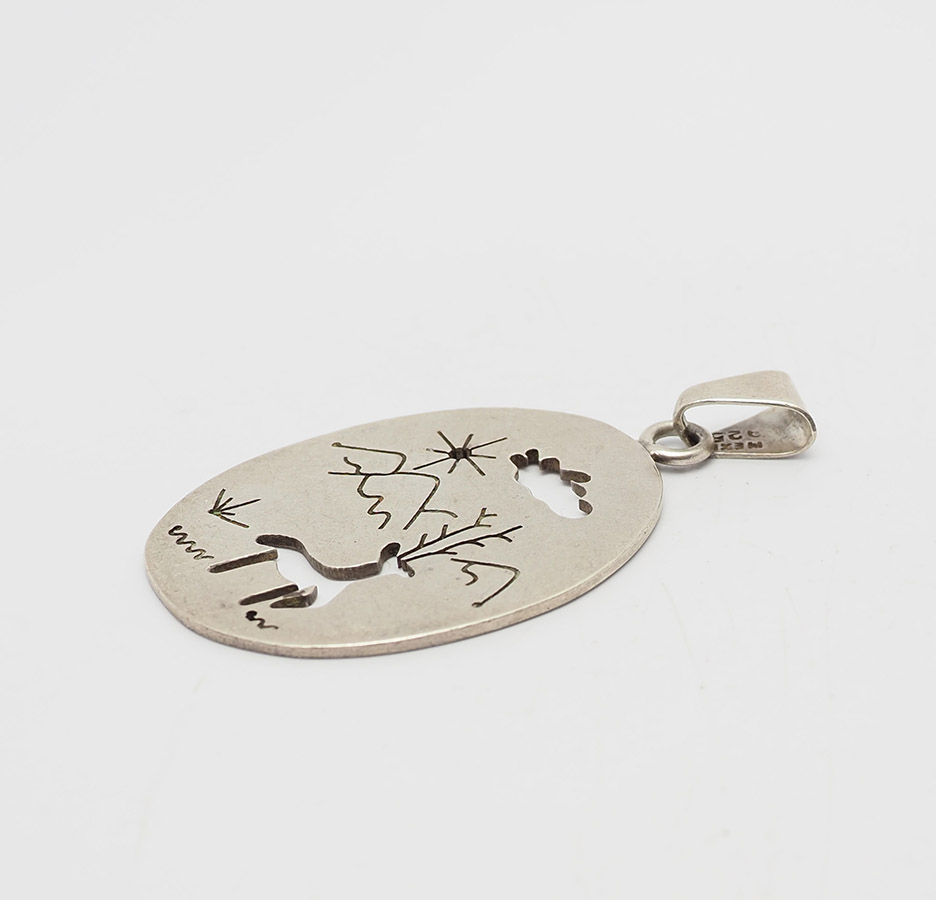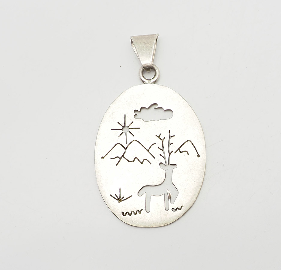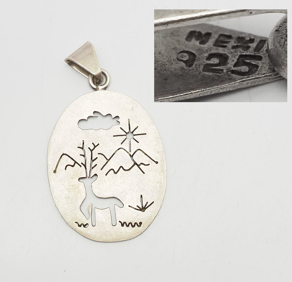 Vintage sterling silver elk in mountains cut out landscape scene pendant, Mexico. Measures 2.25" x 1.3". Weight is 14 grams. Very good condition.