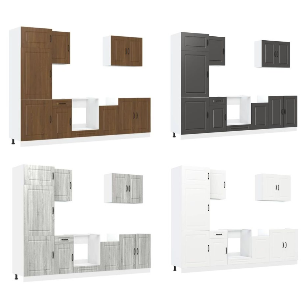 Mit ihrem eleganten Design optimiert diese 11-teilige Küchenzeile Ihre Küche und bietet reichlich Stauraum für Ihre Küchenausstattung! Starkes und langlebiges Material: Holzwerkstoff ist ein langlebiges und robustes Material mit einer glatten Oberfläche, das gegen Feuchtigkeit, Verformung und Rissbildung beständig ist, wodurch es eine zuverlässigen Wahl für die Herstellung von Möbeln ist.Viel Stauraum: Das Küchenschrank-Set hat viele Fächer und bietet ausreichend Platz für Schüsseln, Teller, Töpfe und andere Küchengeräte.Verstellbare Füße: Die Unterschränke sind mit verstellbaren Füßen ausgestattet, die sich in der Höhe an deine Kücheneinrichtung anpassen lassen.Pflegeleicht: Dank der glatten Oberfläche lassen sich diese Küchenschränke leicht mit einem feuchten Tuch reinigen und benötigen weniger Pflege. Achtung:Um ein Umkippen zu vermeiden, sollte dieses Produkt mit der mitgelieferten Wandhalterung gesichert werden. Gut zu wissen:Schrauben und Dübel für die Wandbefestigung sind nicht enthalten. Suchen und verwenden Sie die für Ihre Wände geeigneten Schrauben und Dübel. Wenn Sie unsicher sind, suchen Sie professionelle Hilfe. Lesen und befolgen Sie jeden Schritt der Anleitung sorgfältig.Die Arbeitsplatte, das Spülbecken und der Wasserhahn sind nicht im Lieferumfang enthalten.