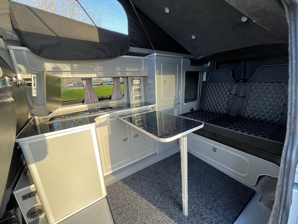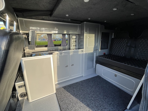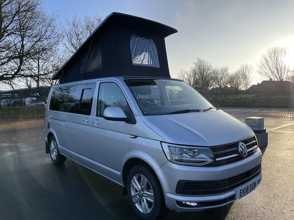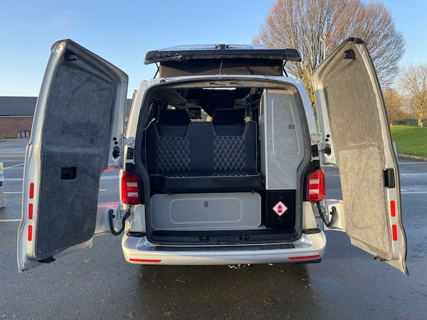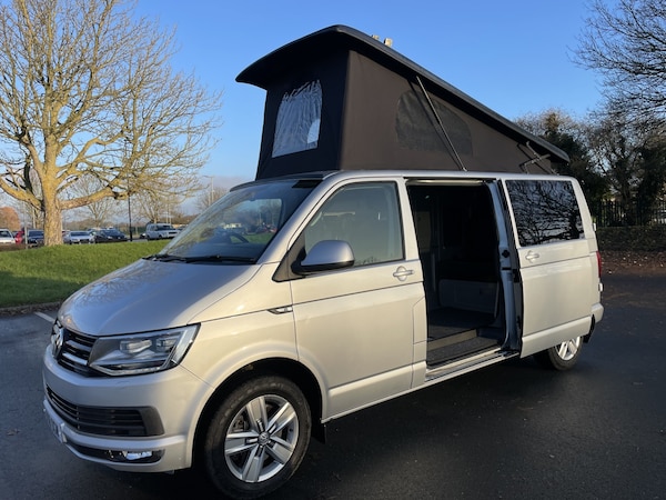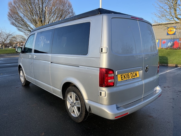 2018 reg VOLKSWAGEN TRANSPORTER 2.0 BiTDI T32 BLUEMOTION DSG AUTO 4 WHEEL DRIVE HIGHLINE EURO 6, 91,000 Miles Diesel Auto Silver air conditioning cruise control twin side loading doors parking sensors bluetooth hands free heated front screen captain and passenger leather chairs electric windows electric wing mirrors black leather 4 seats included drivers, rock and roll camper bed fitted double cooking gas hob hot and cold water sink pop up top extra bed LED lighting all around multi storage cupboards passenger swivel seat usb and 12v sockets electric windows, gas bottle fitted just been fully gas checked ready to go, fridge freezer, diesel heater fitted, LOW RATE FINANCE AVAILABLE NATIONWIDE DELIVERY AVAILABLE only £34995 no vat