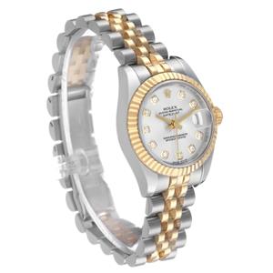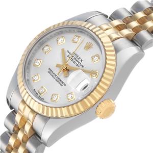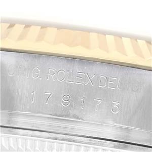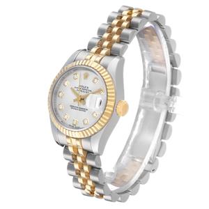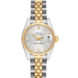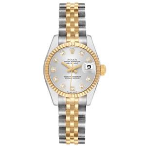 Silver dial with original Rolex factory diamond hour markers and yellow gold baton hands. Date calendar at the 3 o'clock aperture. |