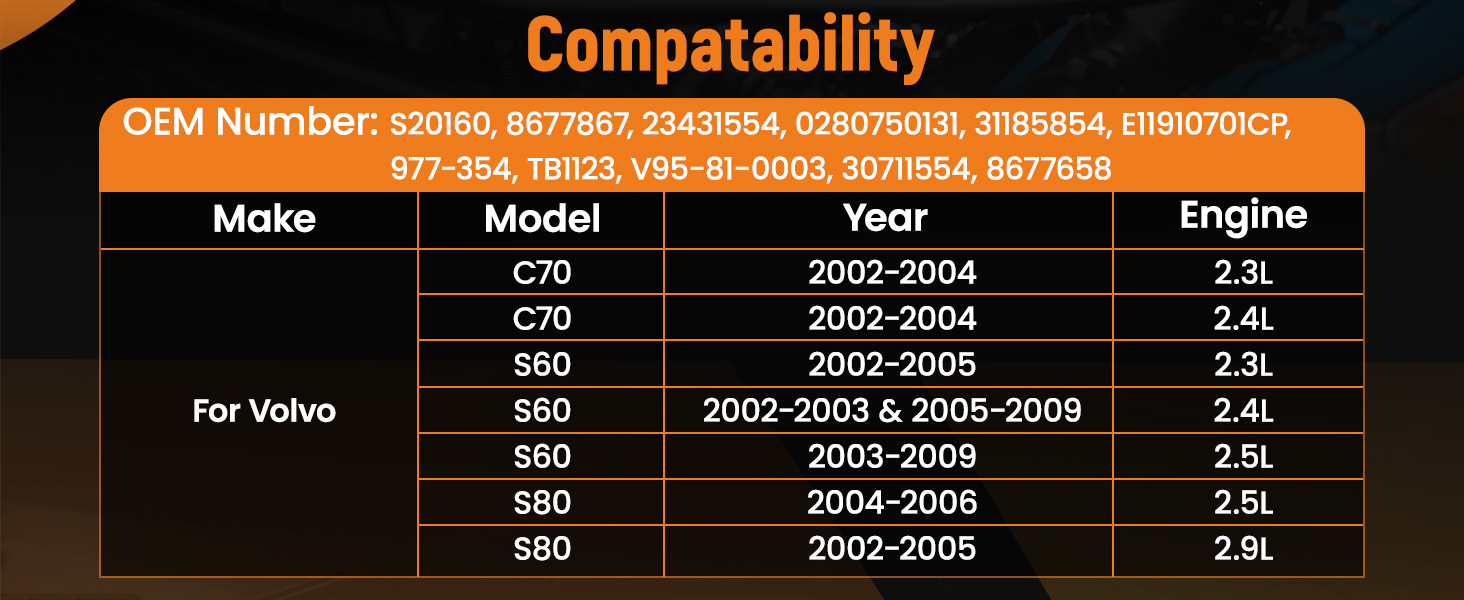 | For Volvo | S60 | 2.4L 2435CC l5 GAS DOHC Turbocharged | 2.4T Sedan 4-Door | 2002 | EBay compatibility is for reference only. Please check the dimensions before the purchasing. |