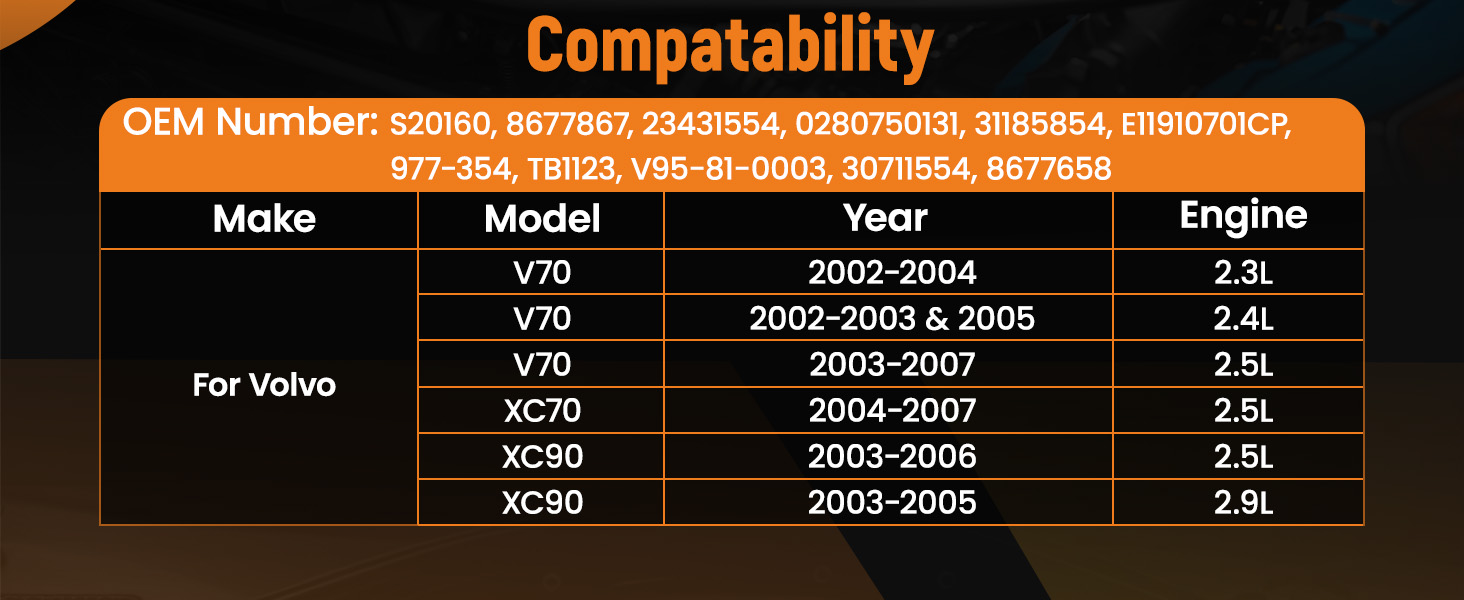 | For Volvo | V70 | 2.4L 2435CC l5 GAS DOHC Naturally Aspirated | Base Wagon 4-Door | 2003 | EBay compatibility is for reference only. Please check the dimensions before the purchasing. |