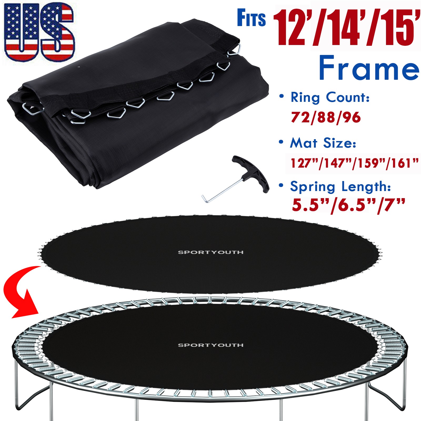 161" Mat with 96 V-hooks Fits 6.5"L Spring 15ft Round Trampoline.