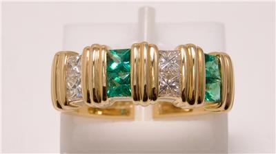 The face of the ring is made up of 4 square cut natural Emeralds & 4 princess cut natural Diamonds which are secured in channel settings making a stripe pattern. Total Diamond weight is 0.40ct approx.