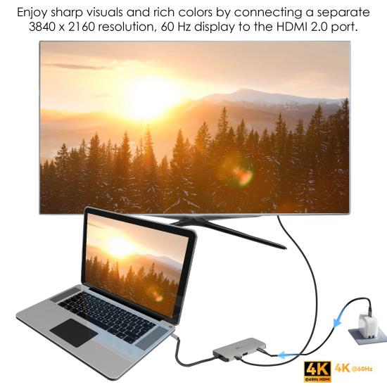 - HDMI 2.0 Port:Connect a separate 3840 x 2160 resolution, 60 Hz display to the HDMI 2.0 port. HDR10 support enhances the color of images and videos with bright highlights and deep shadows.