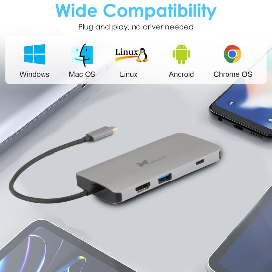 - Multi-Platform Compatibility:The hub works with most USB-C devices, including Windows and Mac laptops, iPad Pro and Android tablets, Chromebooks, and Linux-based systems. No additional drivers are needed, just plug and play.