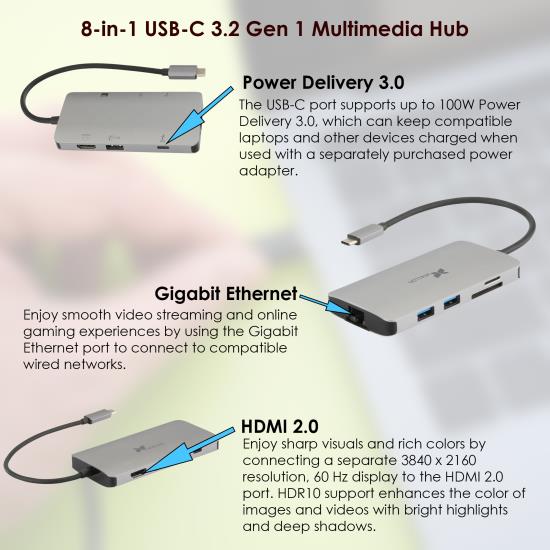 ThisXcellon 8-in-1 USB-C 3.2 Gen 1 Multimedia Hubis an all-in-one solution for enhancing productivity, offering wide compatibility, and delivering high-speed data transfer.