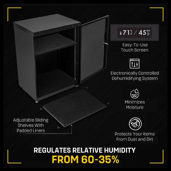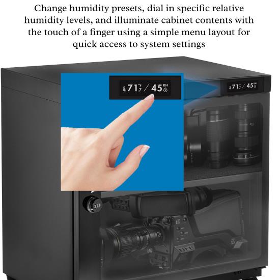 The cabinet uses advanced thermoelectric cooling technology to maintain consistent humidity levels between 60 and 35 percent, creating a safe environment to prevent mold and oxidation. The modern touchscreen control panel lets you easily adjust humidity settings, control the interior lighting, customize the display, and select your preferred language, all with a simple touch.
