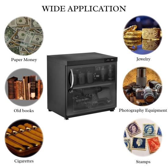 Built for both performance and convenience, the cabinet features adjustable sliding Shelf that allow you to organize your gear as needed. A secure three digit combination lock protects your valuables from unauthorized access, while the sealed glass door blocks out dust and dirt. With no compressor, no fan, and no need for water trays, the cabinet delivers completely silent and energy efficient operation, perfect for use in bedrooms, studios, and offices.