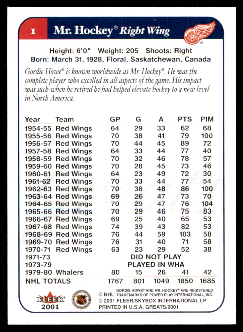 | 2001-02 Greats of the Game Gordie Howe #1 |