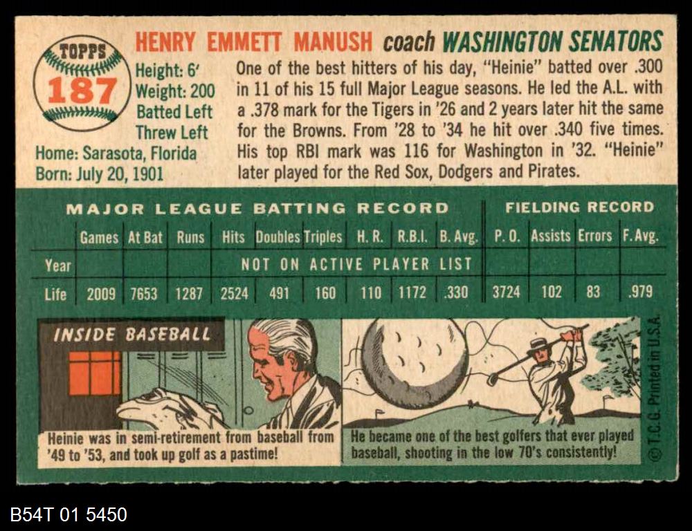 | 1954 Topps #187 Heinie Manush | 5 - EX | Front | Back |