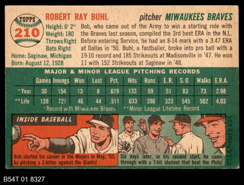 | 1954 Topps #210 Bob Buhl | 5 - EX | Front | Back |