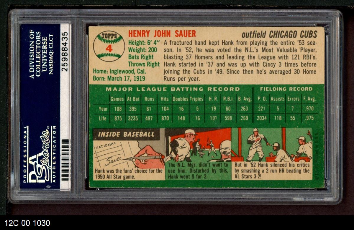 | 1954 Topps #4 WHT Hank Sauer | PSA 5 - EX | Front | Back |
