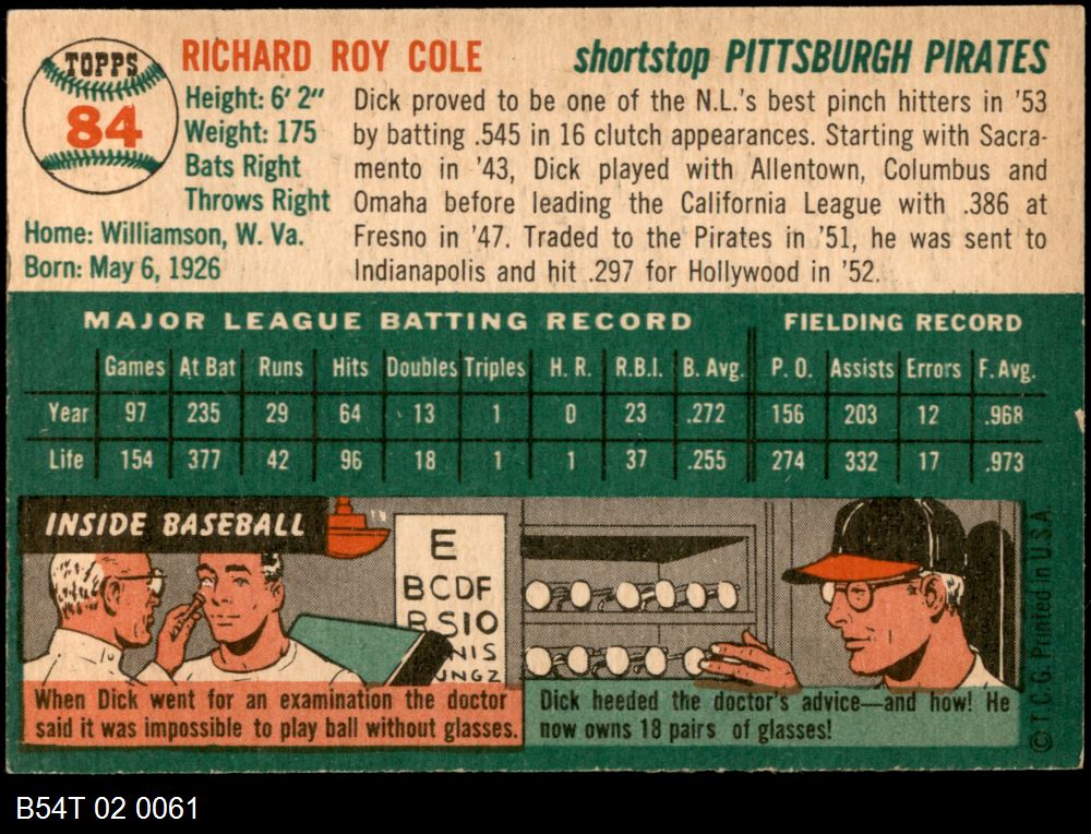 | 1954 Topps #84 Dick Cole | 6 - EX/MT | Front | Back |