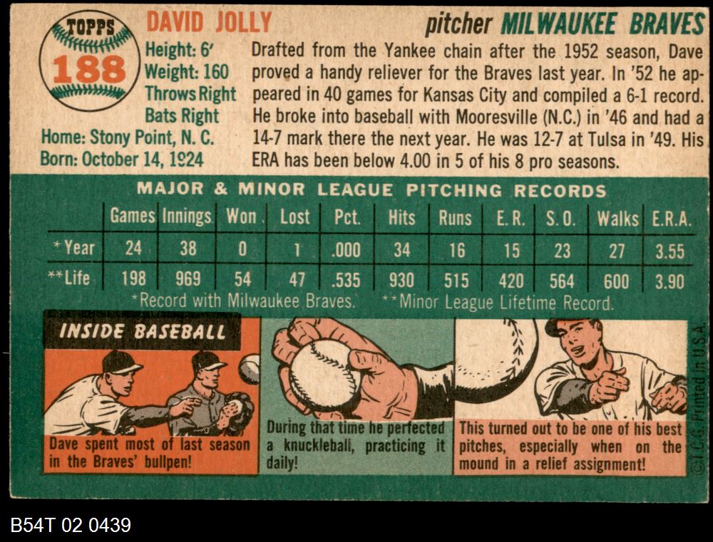 | 1954 Topps #188 Dave Jolly | 6 - EX/MT | Front | Back |