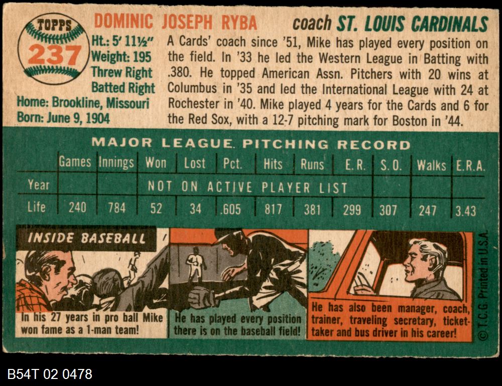 | 1954 Topps #237 Mike Ryba | 4 - VG/EX | Front | Back |