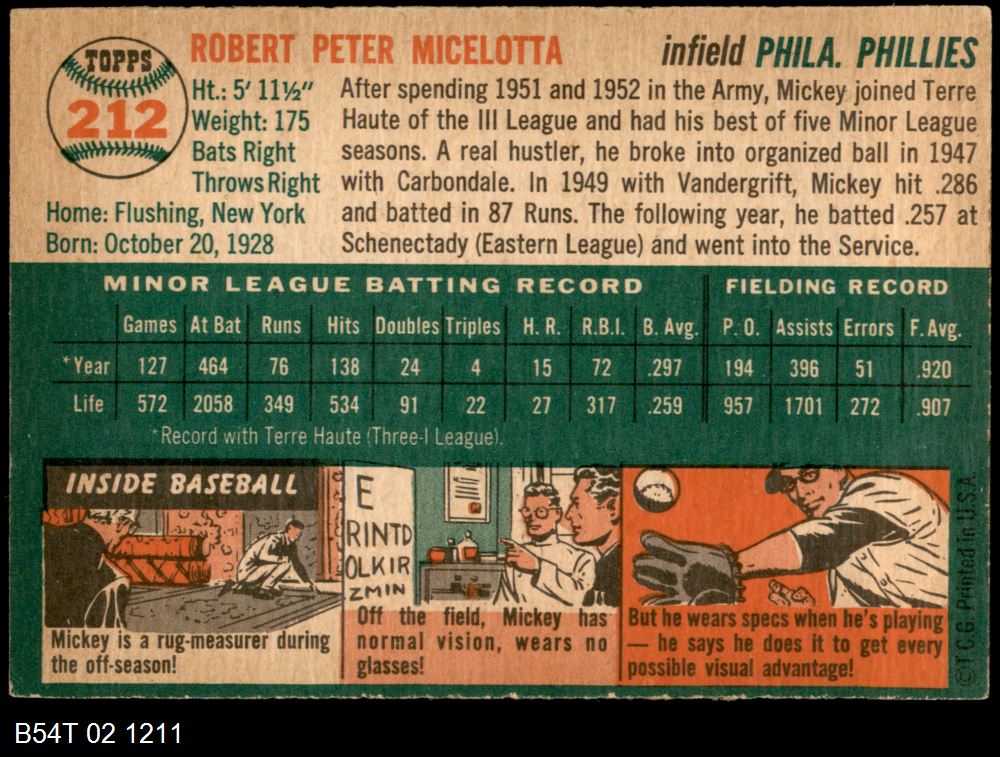 | 1954 Topps #212 Mickey Micelotta | 5 - EX | Front | Back |