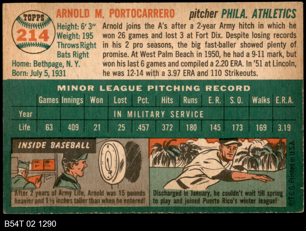 | 1954 Topps #214 Arnie Portocarrero | 5 - EX | Front | Back |