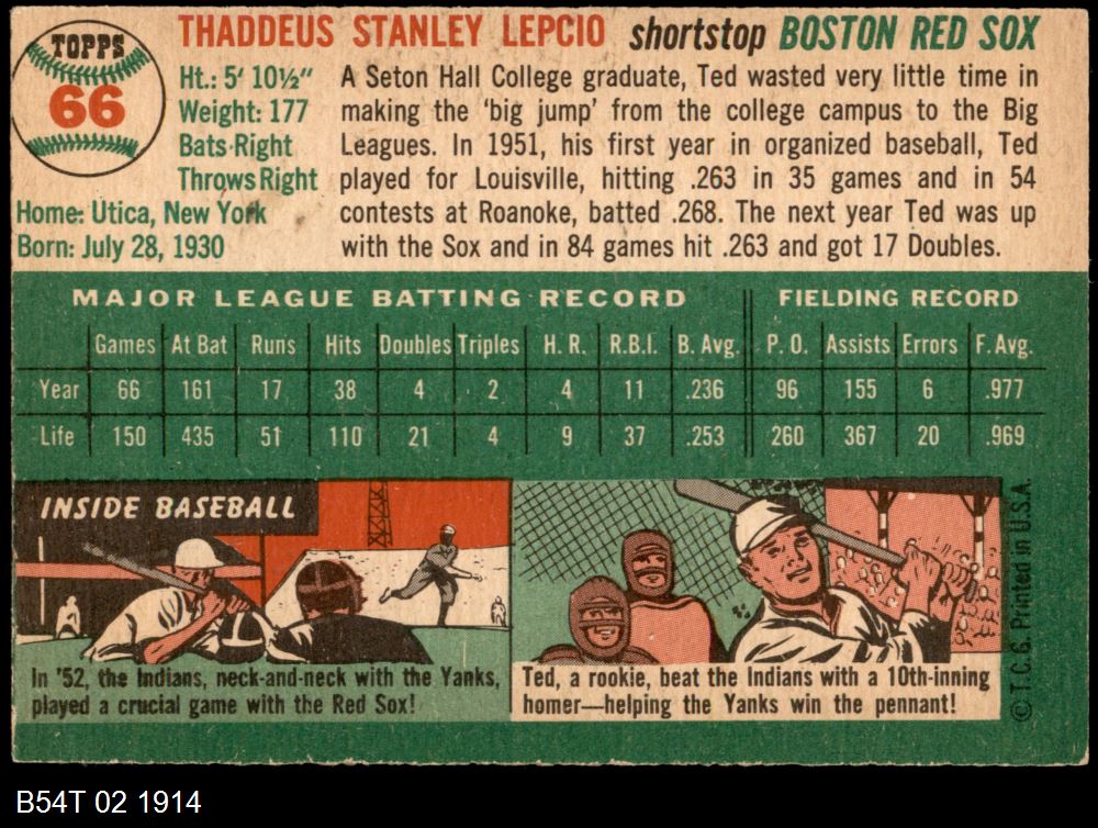 | 1954 Topps #66 Ted Lepcio | 5 - EX | Front | Back |