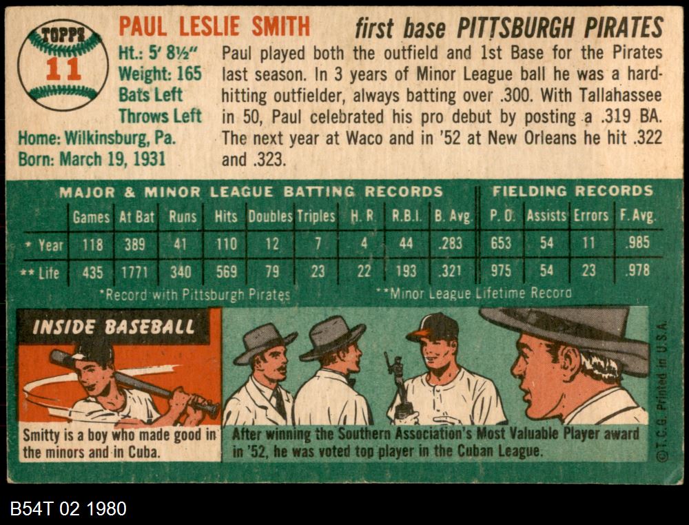 | 1954 Topps #11 WHT Paul Smith | 5 - EX | Front | Back |
