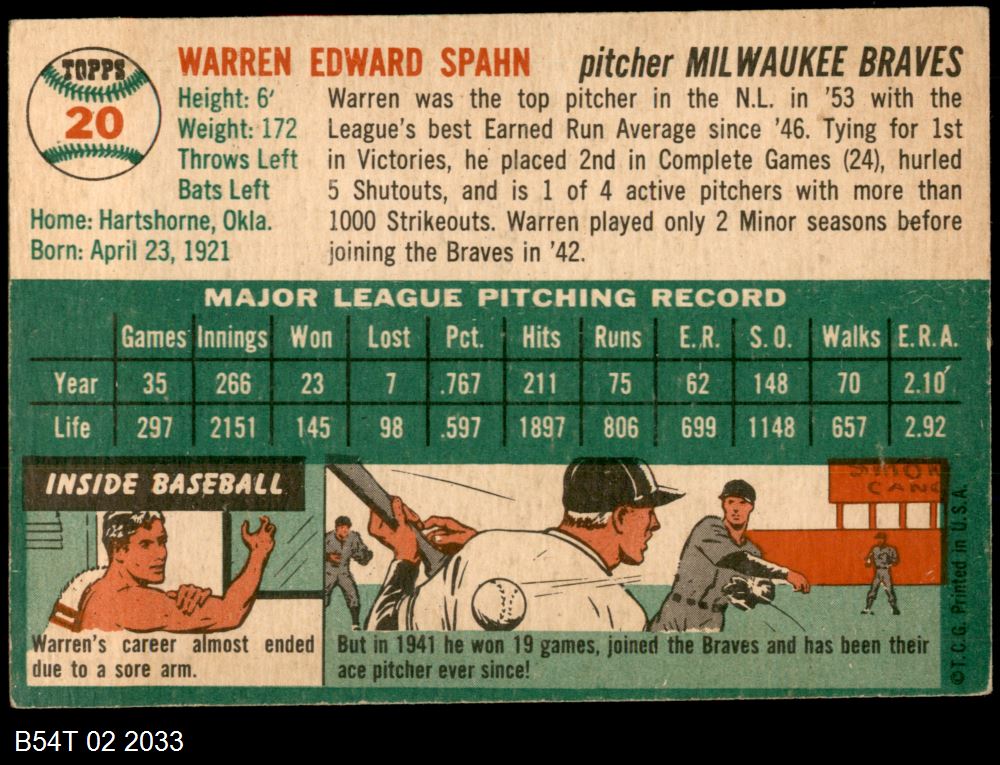| 1954 Topps #20 WHT Warren Spahn | 5 - EX | Front | Back |