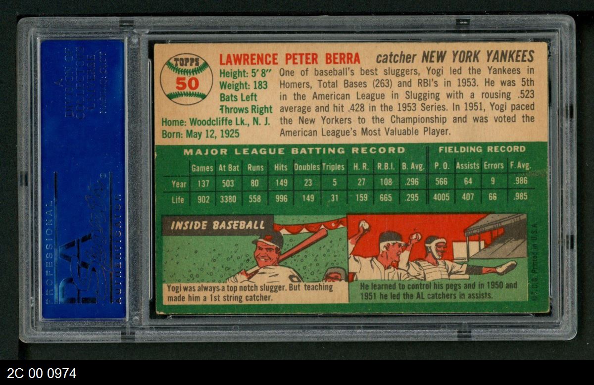 | 1954 Topps #50 WHT Yogi Berra | PSA 5 - EX | Front | Back |