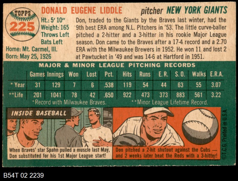 | 1954 Topps #225 Don Liddle | 6 - EX/MT | Front | Back |