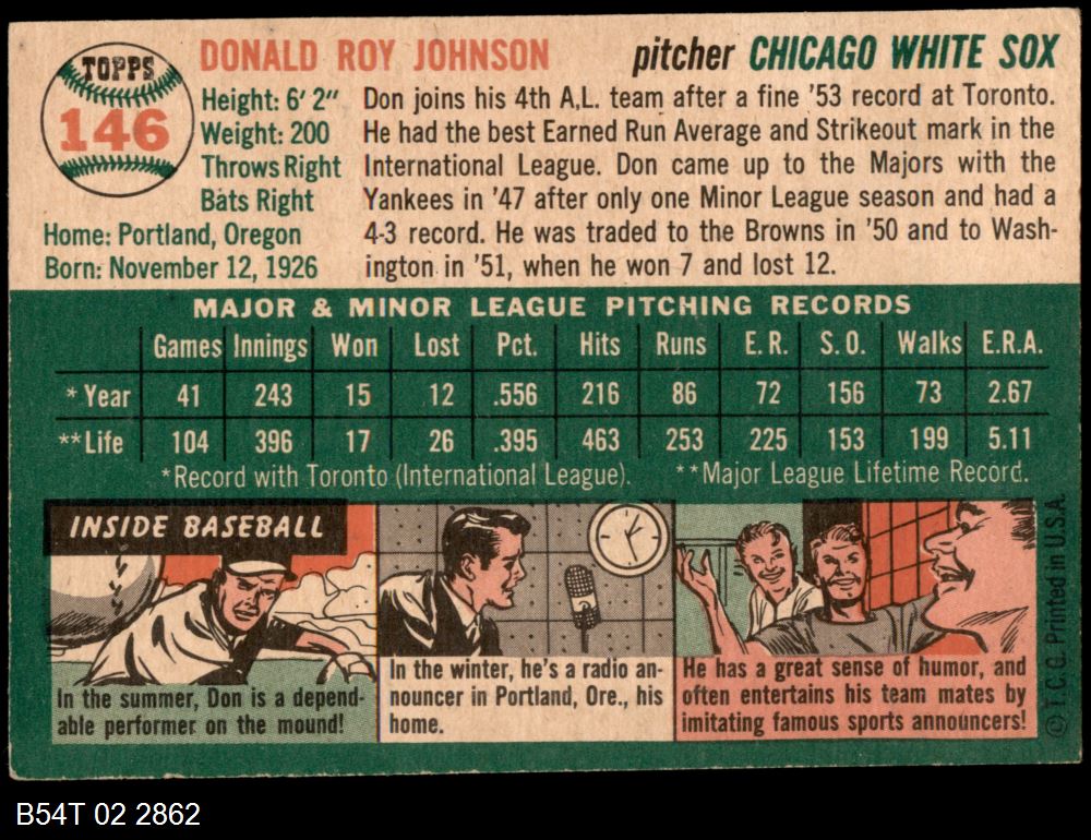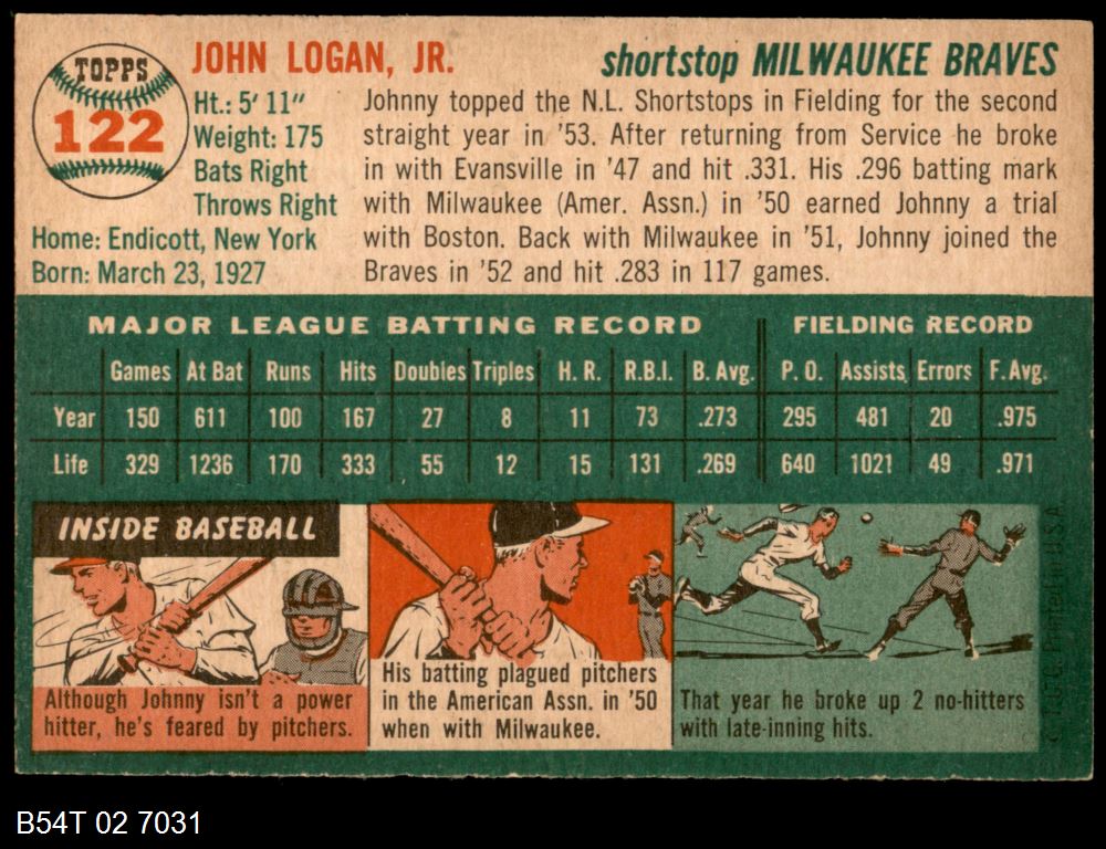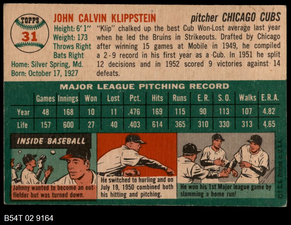 | 1954 Topps #31 WHT Johnny Klippstein | 4 - VG/EX | Front | Back |
