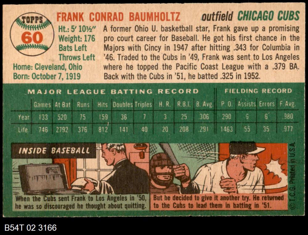 | 1954 Topps #60 Frank Baumholtz | 5 - EX | Front | Back |