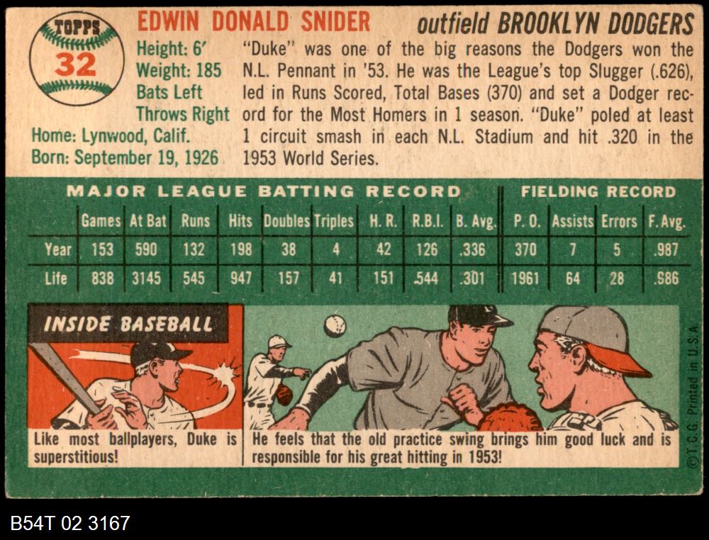 | 1954 Topps #32 WHT Duke Snider | 4 - VG/EX | Front | Back |