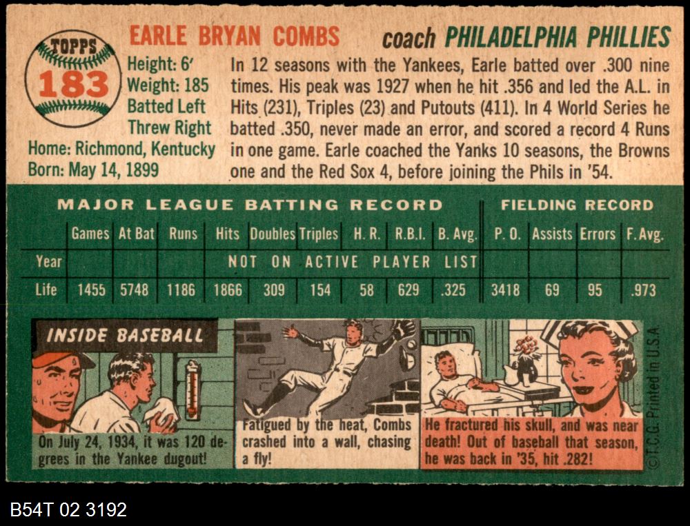 | 1954 Topps #183 Earl Coombs Combs | 6 - EX/MT | Front | Back |
