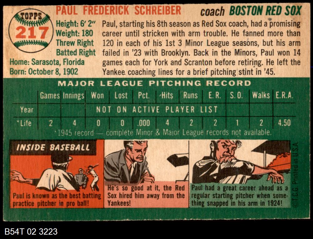 | 1954 Topps #217 Paul Schreiber | 5 - EX | Front | Back |